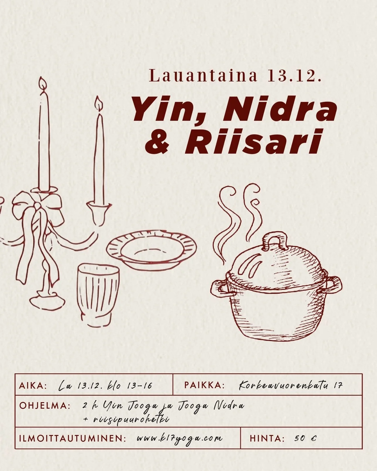 Ota breikki juhlakauden kiireistä ja tule viettämään laatuaikaa itsesi kanssa hermostoa hellivän harjoituksen pariin. Yin jooga ja jooga nidra johdattaa sinut syvän levon ja läsnäolon tilaan, josta pääset harjoituksen päätteeksi nauttimaan ihanan joulupuuron lämpimässä yhteisössä❤️🍚